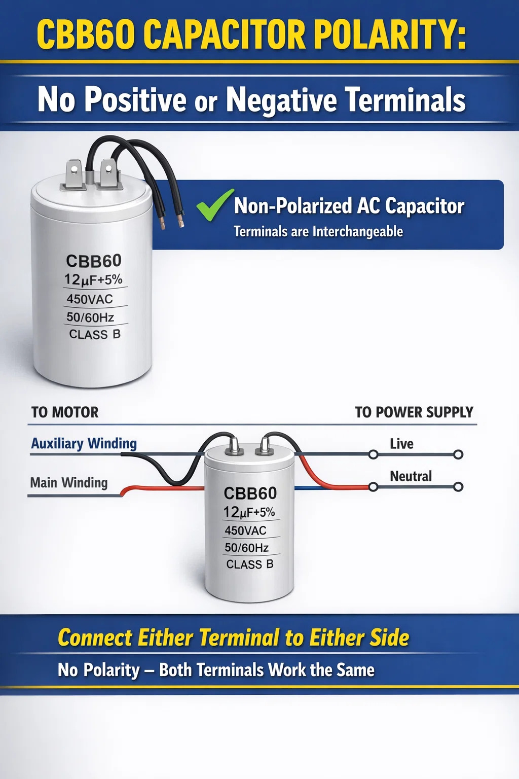 CBB60 kondensaattori on ei positiivista eikä negatiivista . Se on polaroimaton AC-kondensaattori, mikä tarkoittaa, että sillä ei ole nimettyä positiivista tai negatiivista napaa. Voit kytkeä jommankumman liittimen piirin kummallekin puolelle ilman vaurioiden tai toimintahäiriöiden riskiä. Tämä on yksi perustavanlaatuisimmista ominaisuuksista, joka erottaa sen elektrolyyttikondensaattoreista, jotka ovat tiukasti polarisoituneita ja epäonnistuvat - tai jopa räjähtävät - jos ne on kytketty väärin.