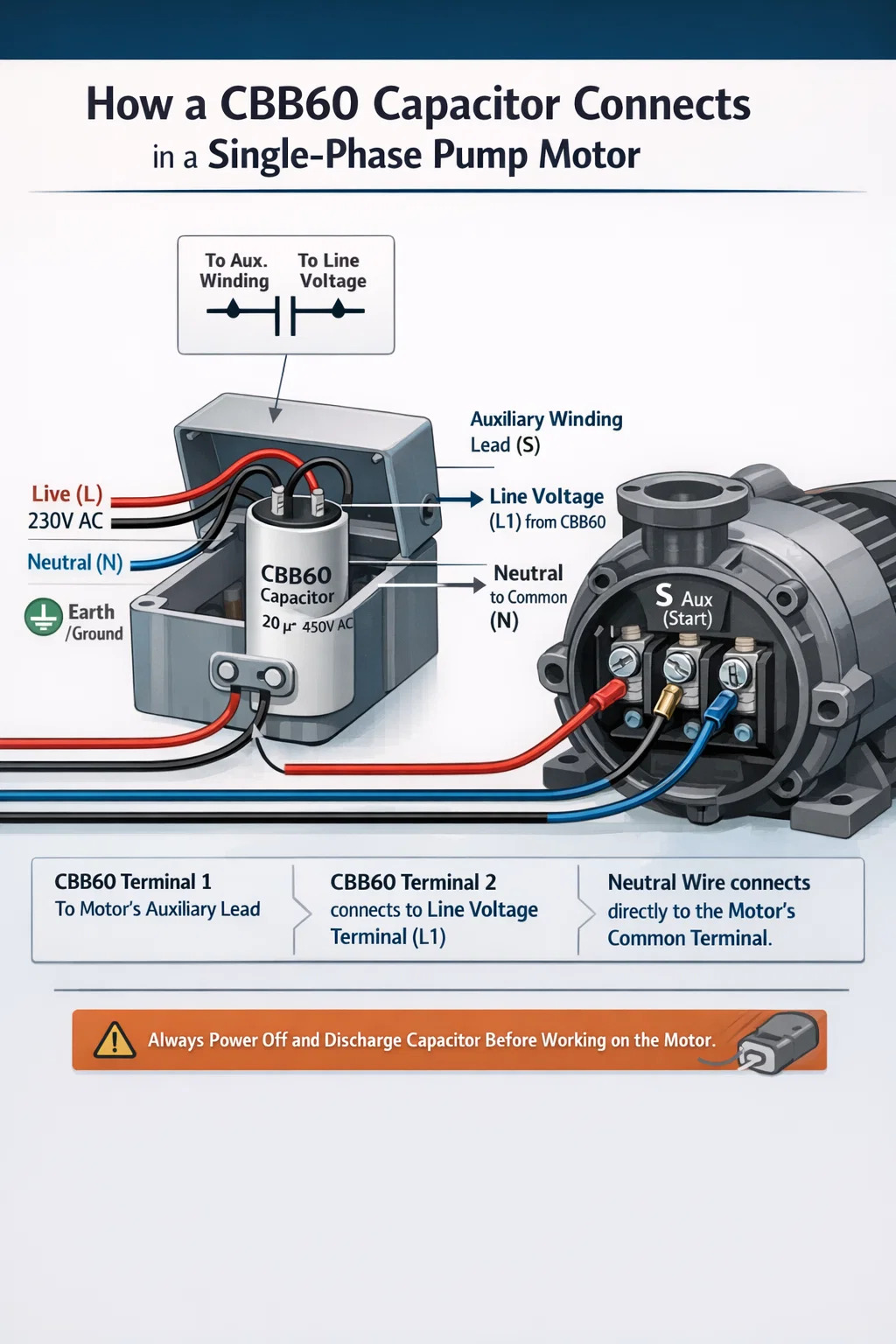 Tämä menettely kattaa yleisimmän CBB60-asennuksen: yksivaiheisen vesipumpun tai allaspumpun moottorin joko ulkoisella kondensaattorikotelolla tai kondensaattorilla suoraan moottorin liitäntärasian sisällä. Sama logiikka pätee ilmakompressoreihin, pesukoneisiin ja LVI-puhallinmoottoreihin.