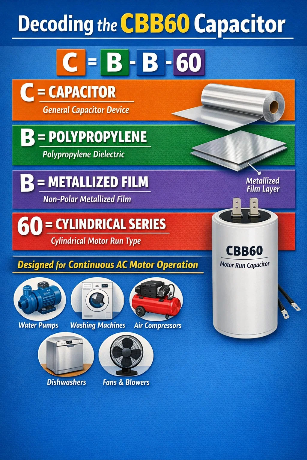 Koodi itsessään on aakkosnumeerinen lyhenne, jossa jokaisella kirjaimella on tietty tekninen painoarvo koskien laitteen sisäistä rakennetta ja sovellusta. Toisin kuin käynnistyskondensaattorit, jotka potkuvat ulos piiristä, kun moottori saavuttaa nopeuden, CBB60 kondensaattori on rakennettu kestämään ja jatkuvaan sähkökäyttöön.