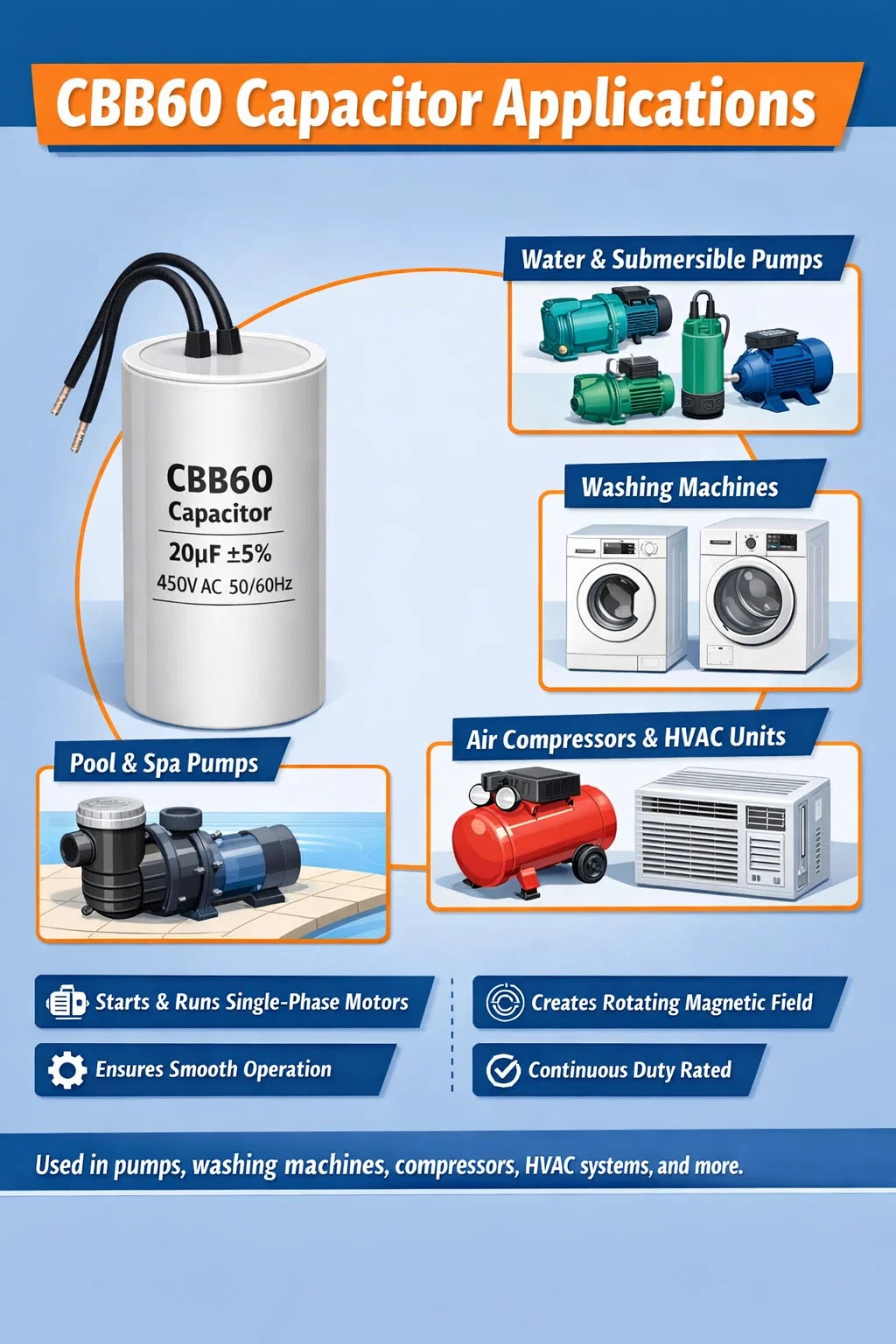 Allas- ja kylpyläkiertopumput, kastelujärjestelmän pumput, viljankäsittelymoottorit, pienet sorvit ja jopa jotkin kaupallisten jäähdyttimien jäähdytyskompressorit käyttävät CBB60-kondensaattoreita. Mikä tahansa sovellus, joka käyttää pysyvästi jaettua kondensaattoria (PSC) tai kondensaattorikäynnistyskondensaattorikäyttöistä (CSCR) yksivaiheista oikosulkumoottoria, voi mahdollisesti käyttää CBB60:tä käyntiasennossa.