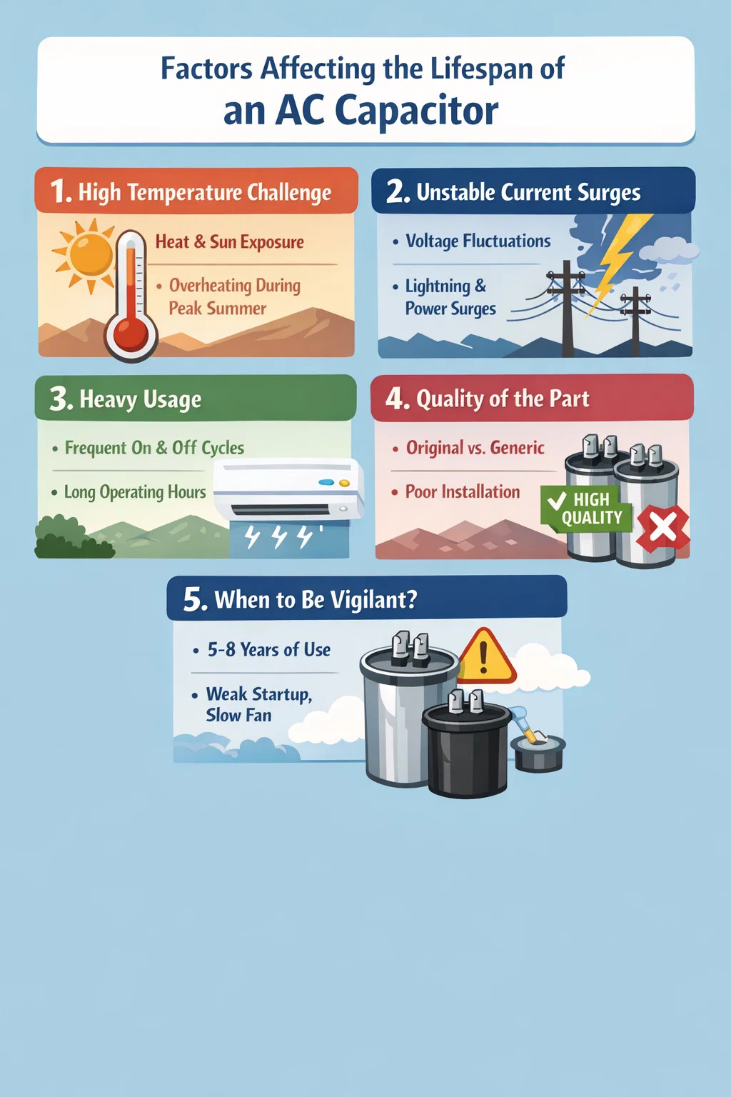 Viidestä kahdeksaan vuotta: Useimpien tavallisten kotitalouksien ilmastointilaitteiden AC-kondensaattorin suorituskyky alkaa heikentyä viiden tai kuuden vuoden käytön jälkeen.